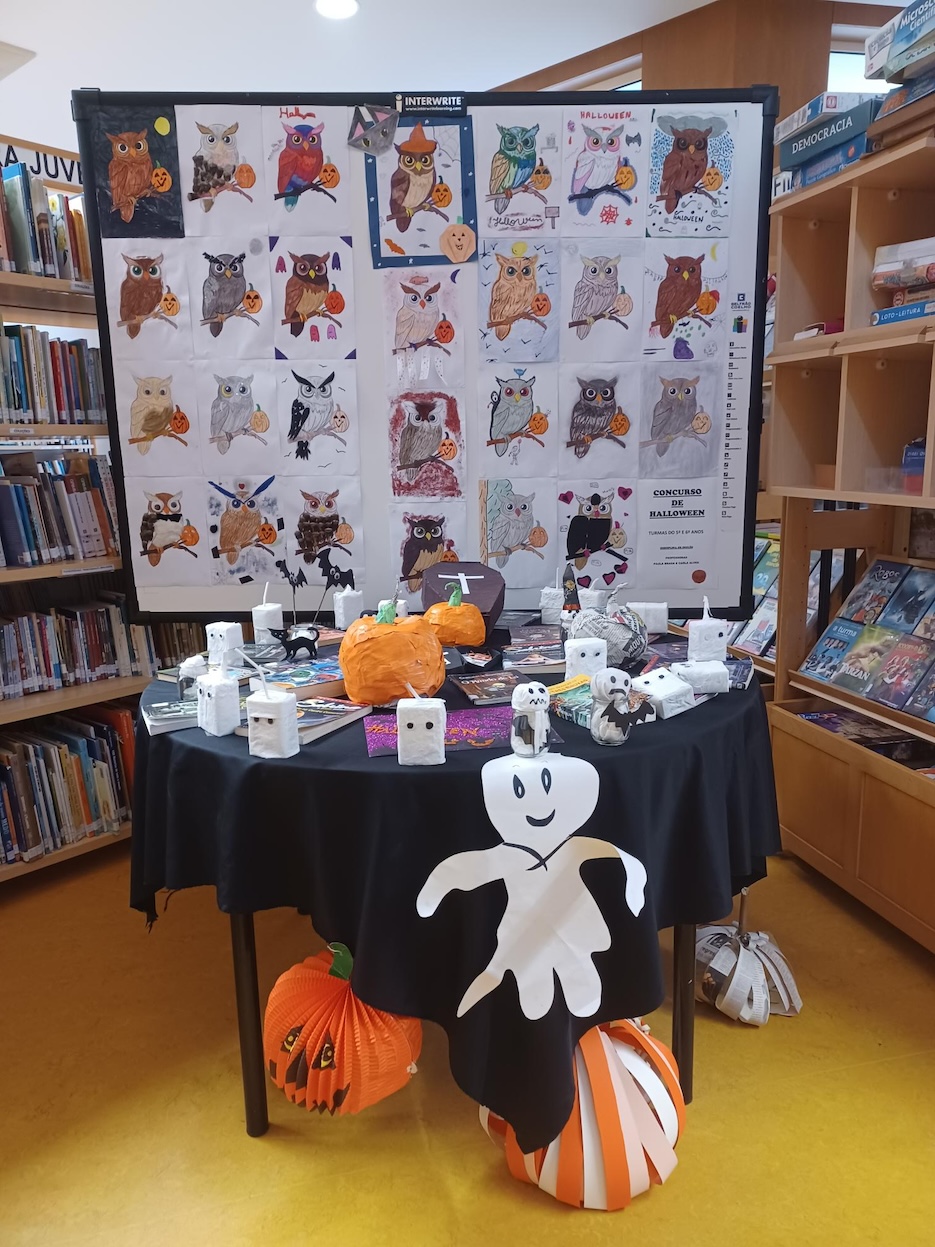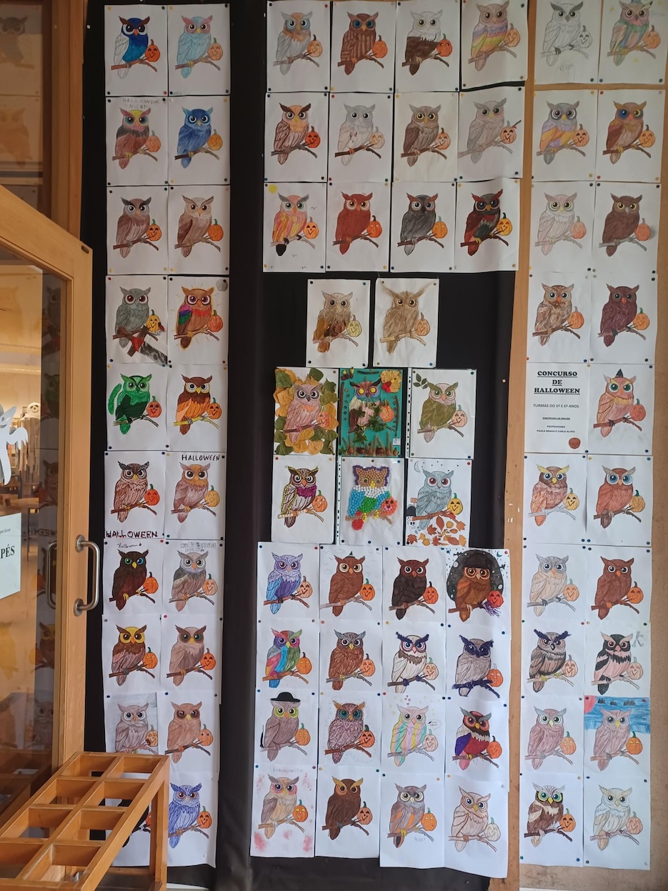Para assinalar o Haloween, em articulação da Biblioteca Escolar da EBSC com as professoras de Inglês do 2º ciclo — Carla Alves e Paula Braga —, os alunos das turmas dos 5º e 6º anos foram desafiados a colorir e decorar um dos motivos alusivos a esta época, os mochos, ave noturna por excelência, simultaneamente atrativos e assustadores. O resultado está agora em exposição na Biblioteca, em três locais diferentes, e em breve aqui daremos notícia dos trabalhos selecionados pelo júri para receberem prémios.