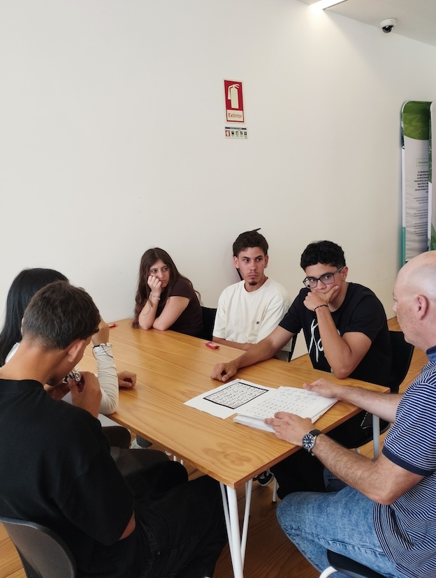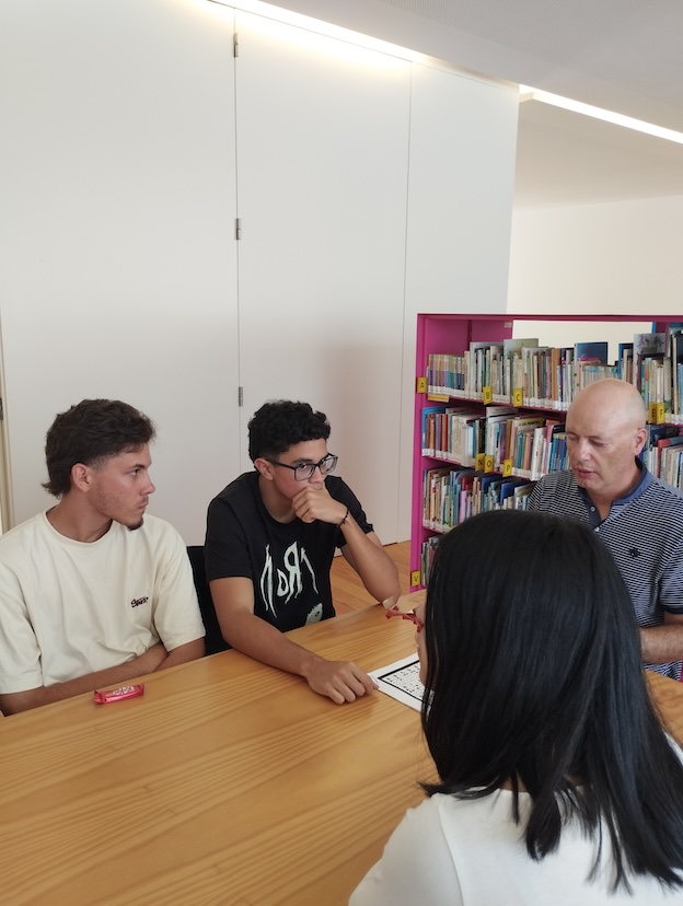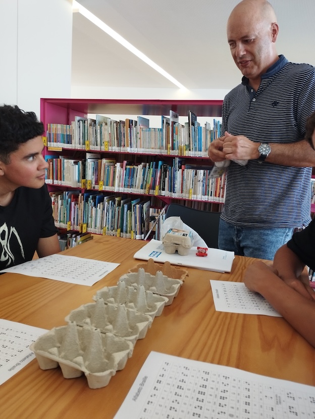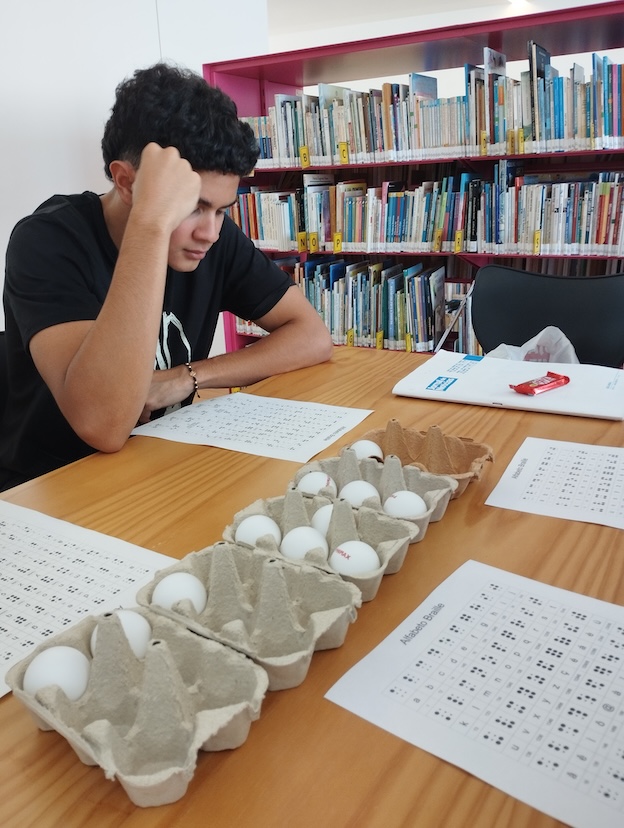 Os alunos de Português Língua Não Materna dos 10º B C e E da EBS de Caminha, acompanhados pela sua professora Carla Alves, visitaram esta semana a Biblioteca Municipal de Caminha para conversarem um pouco com o Rui Castro sobre o Braille e a sua adaptação à vida com a baixa visão que possui presentemente. Neste breve encontro contactámos com o alfabeto em Braille e aprendemos a escrever os nossos nomes com a utilização de caixas de ovos e bolas de ping-pong. De salientar que o Braille não é uma língua, é um sistema de escrita táctil baseado em pontos de relevo que permite às pessoas invisuais ou de baixa visão ler e escrever. O Rui explicou-nos que o digital tem ajudado as pessoas com esta problemática, mas que o Braille é insubstituível. Exemplificou-nos como consegue fazer várias tarefas com o seu telemóvel e ficámos admirados com a velocidade auditiva que o Rui desenvolveu. Agradecemos-lhe tudo o que nos ensinou e a partilha da forma correta de enfrentar os obstáculos que nos vão surgindo.