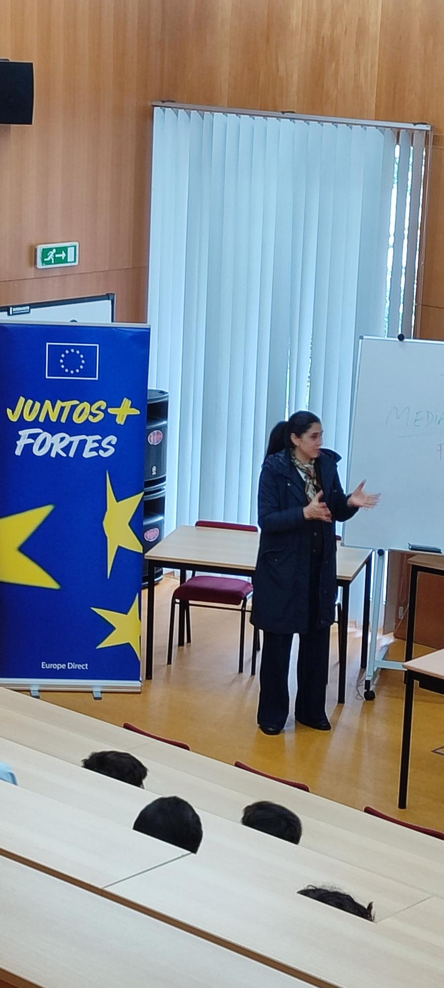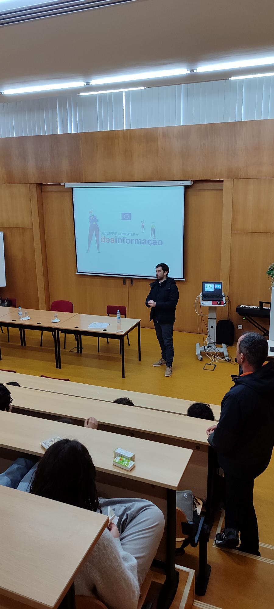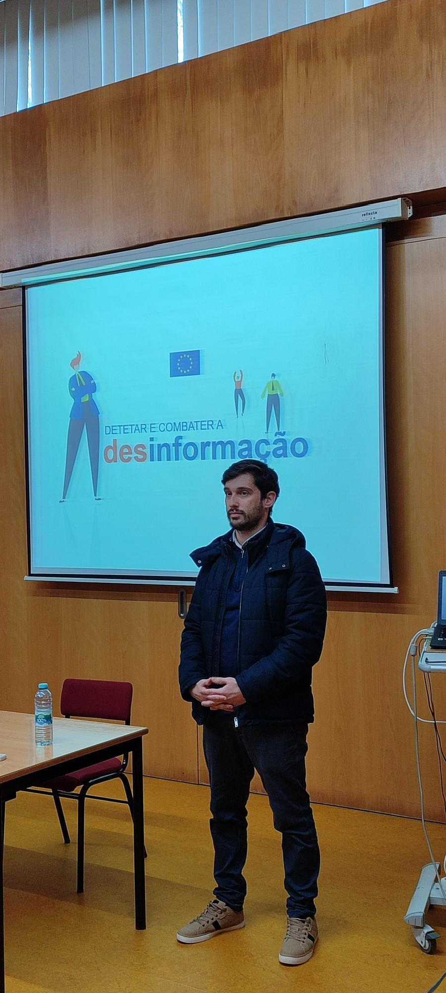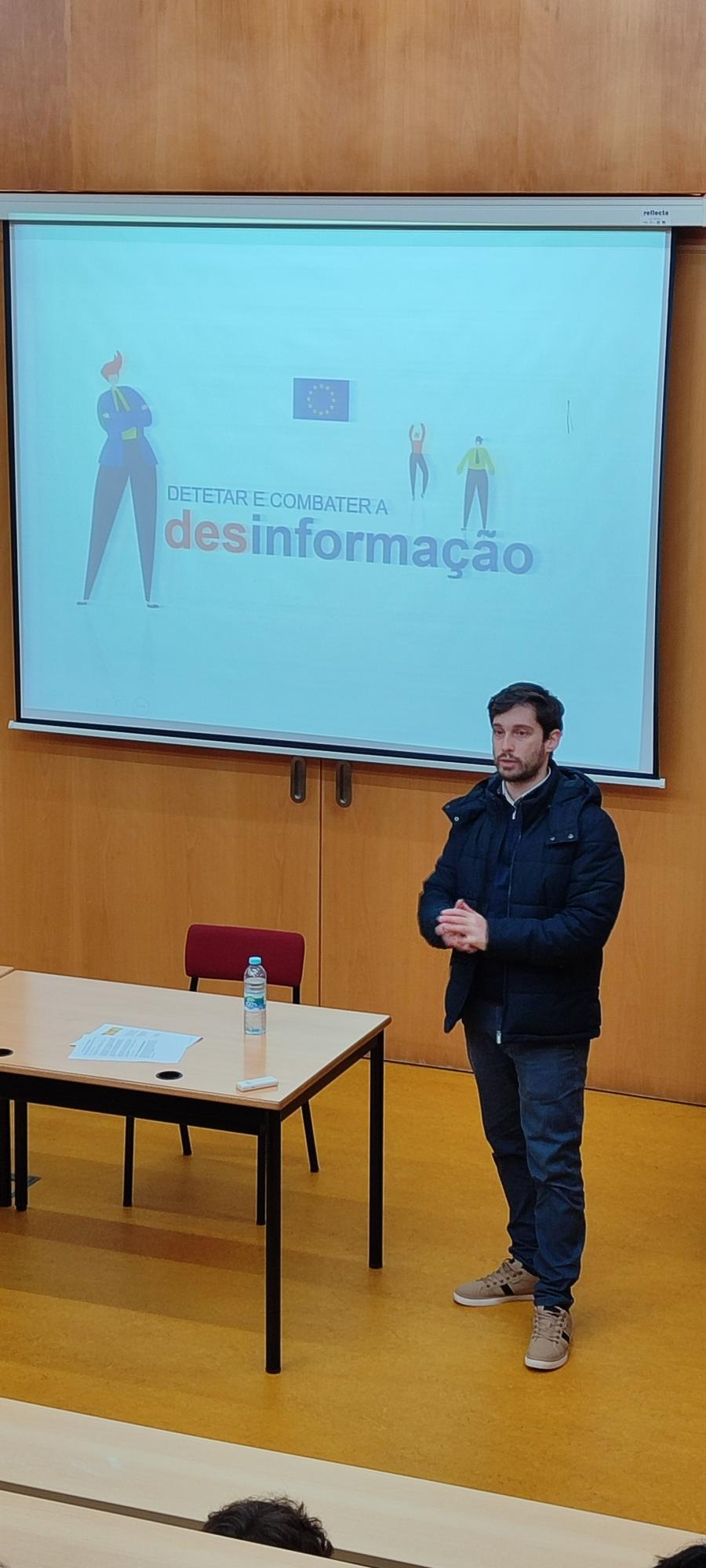 Numa organização das Bibliotecas Escolares em articulação com a disciplina de Cidadania, esteve esta terça-feira de manhã na EBS de Caminha José Ricardo Sousa - Técnico do "Europe Direct Minho" — projeto do Instituto Politécnico do Cávado e do Ave em colaboração com a Comissão Europeia, que veio falar aos alunos das turmas do 8º ano (em duas sessões) sobre Media e Desinformação. Uma temática que está na ordem do dia pelos efeitos nefastos para a vida em sociedade, e que deu origem a um animado debate com os jovens, quase todos com experiências recentes com as chamadas fake news. Os nossos agradecimentos a José Ricardo de Sousa, à professora Clara Vieira, que fez a intermediação com a disciplina de Cidadania e as turmas, bem como aos professores que acompanharam os alunos no Auditório da Biblioteca, Elisabete Estrela, Jorge Silva e Vítor Ribeiro.