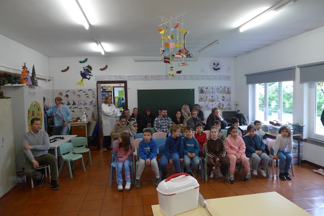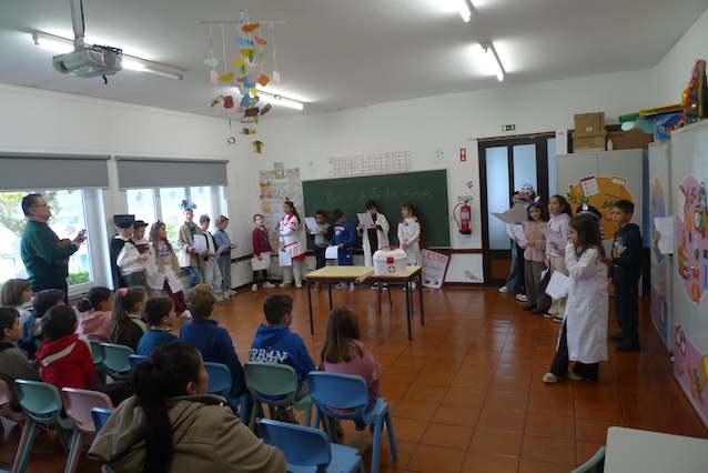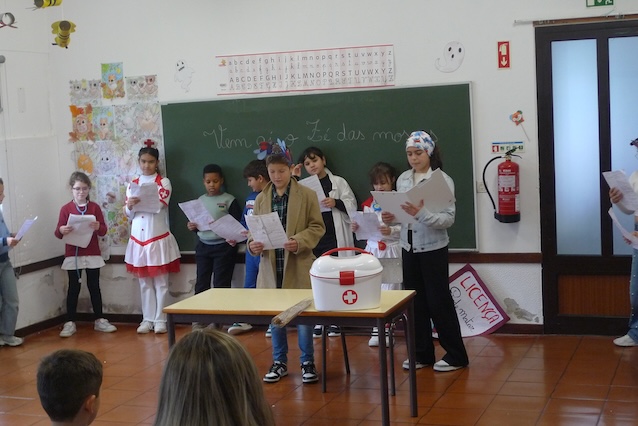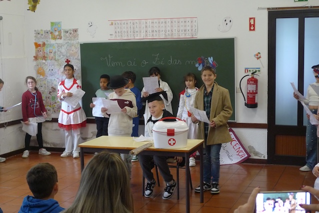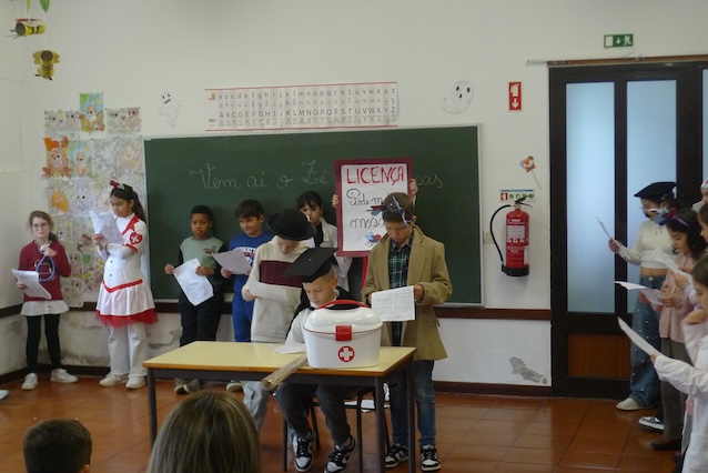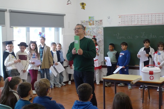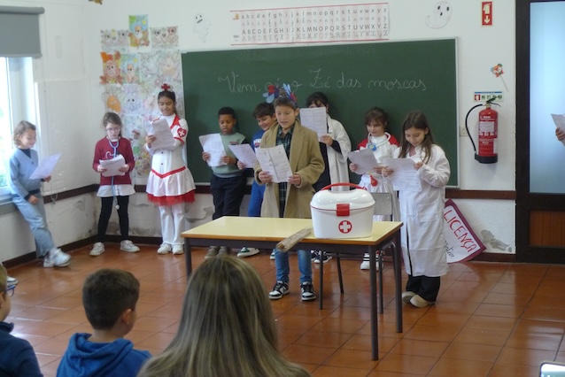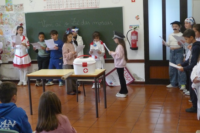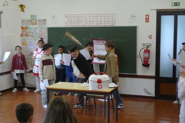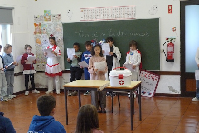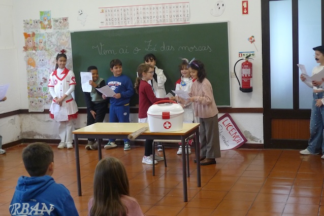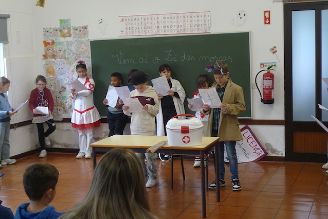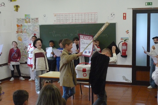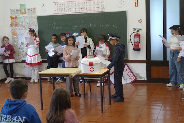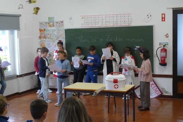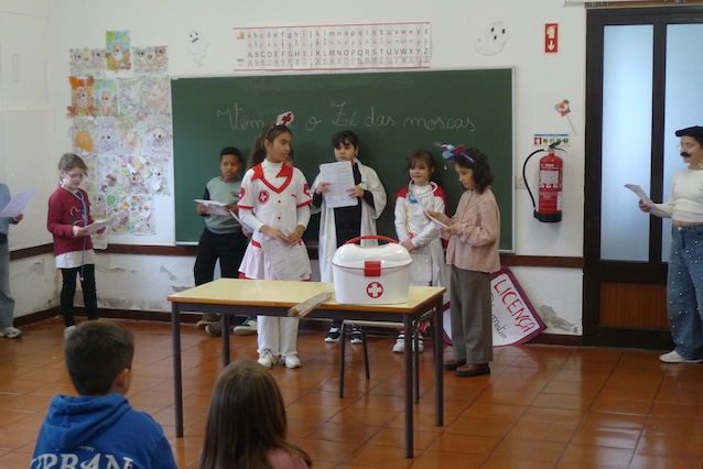 Nesta chuvosa quinta-feira de manhã, 13 de novembro, decorreu numa das salas da EB1 de Vilarelho a apresentação pública do workshop do drama musicado "Vem aí o Zé das Moscas", a partir de um texto de António Torrado. Os atores foram as meninas e meninos do 4º ano, da sala do professor Carlos Carvalho, e a orientação coube ao professor Filipe Passos — técnico especializado que pelo sexto ano consecutivo trabalha no nosso agrupamento no âmbito do Plano de Desenvolvimento Pessoal, Social e Comunitário do Programa Nacional de Promoção do Sucesso Escolar, em articulação com as Bibliotecas Escolares e os departamentos curriculares. A assistência foi composta pelos alunos dos 1º e 2º anos, da sala da professora Cristina Bacelos, e ainda por muitos pais e encarregados de educação, que quiseram vir à escola para ver e aplaudir os seus educandos.