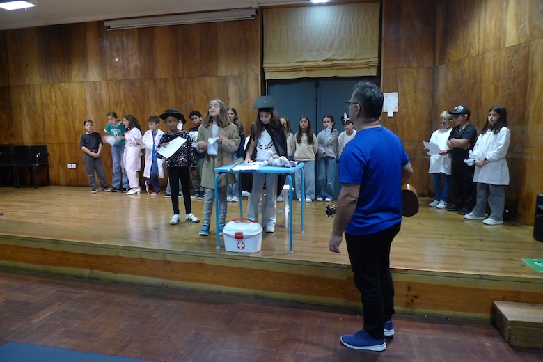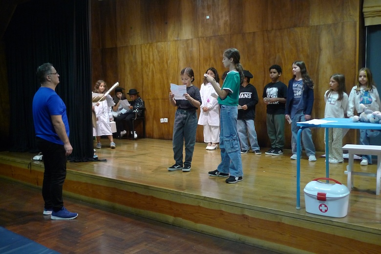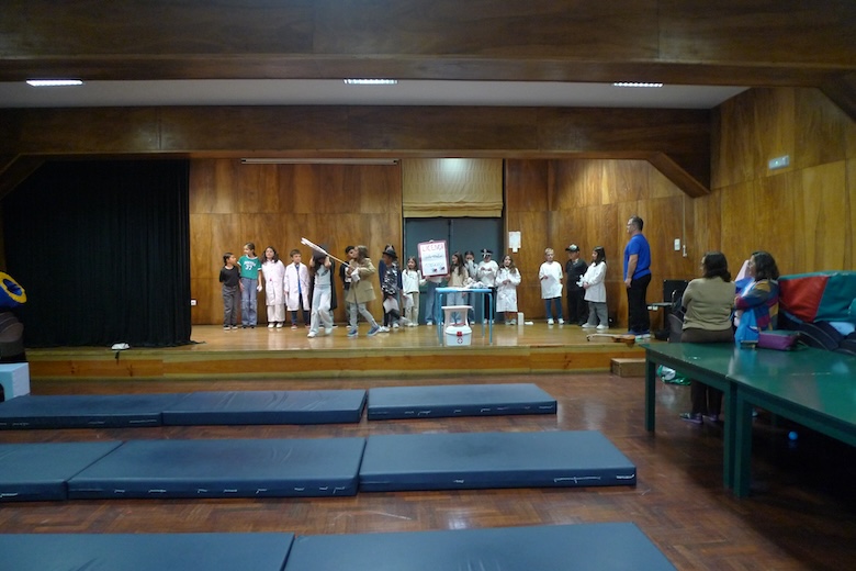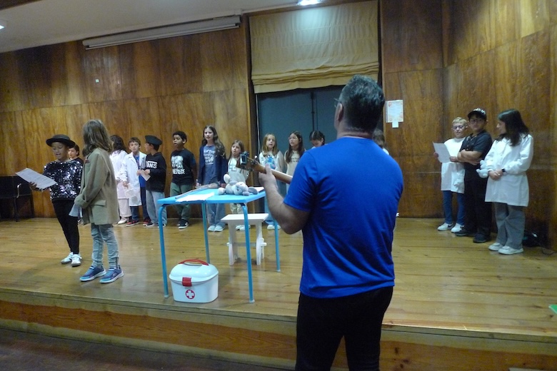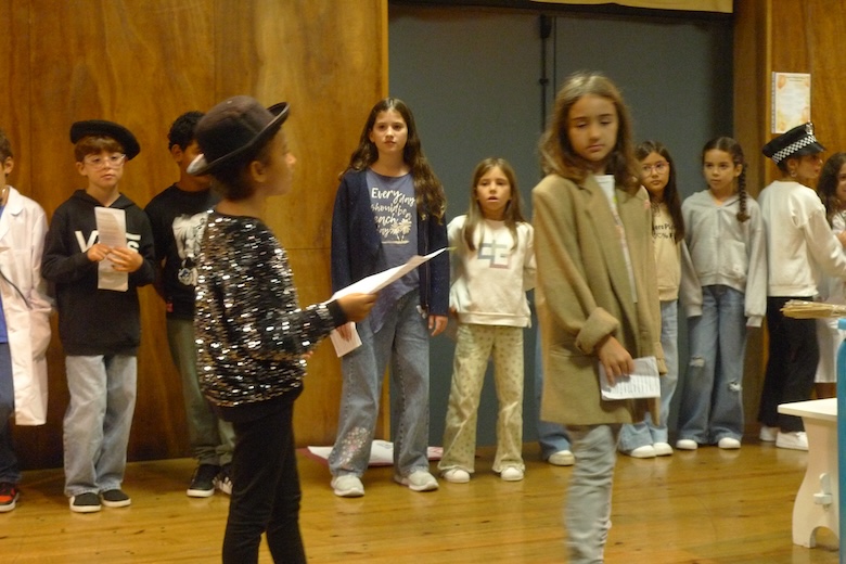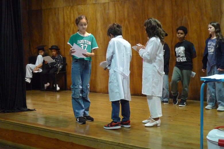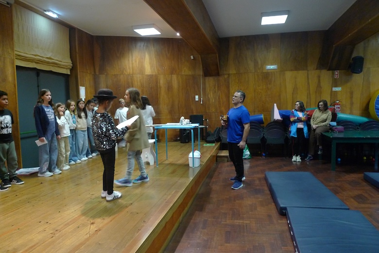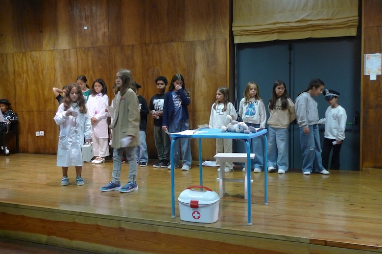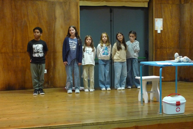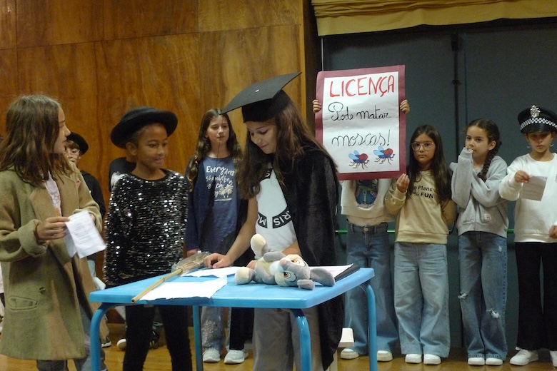 Para culminar uma semana de trabalho à volta do texto de António Torrado, as meninas e meninos do 4º ano da EB1 de Moledo, da sala da professora Celeste Barreiros, fizeram esta quinta-feira de manhã a apresentação do drama musicado "Vem aí o Zé das Moscas", sempre sob a orientação de Filipe Passos, técnico especializado do agrupamento no âmbito do Plano de Desenvolvimento Pessoal, Social e Comunitário do Programa Nacional de Promoção do Sucesso Escolar, em articulação com as Bibliotecas Escolares e os departamentos curriculares. O espetáculo decorreu no ótimo palco do Centro de Dia de Moledo — onde os alunos almoçam diariamente — perante os colegas dos outros anos de escolaridade e os utentes do Centro de Dia.