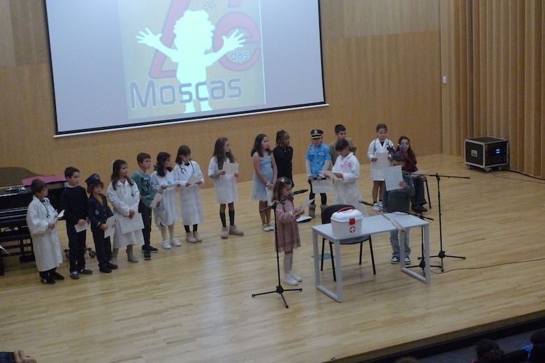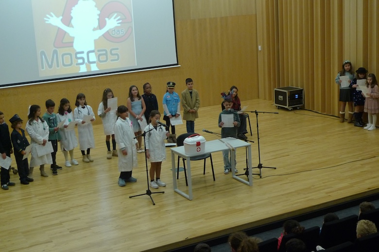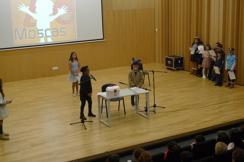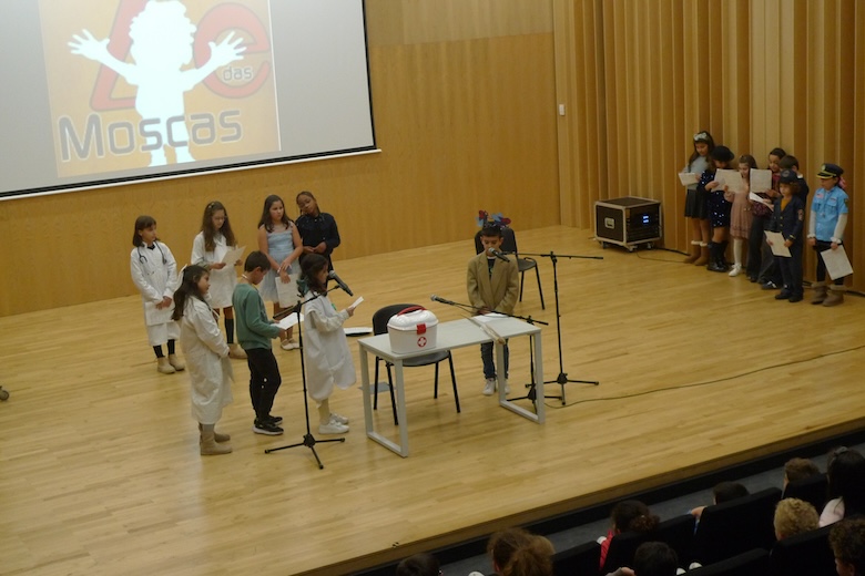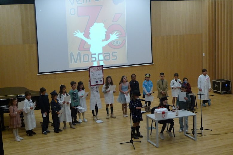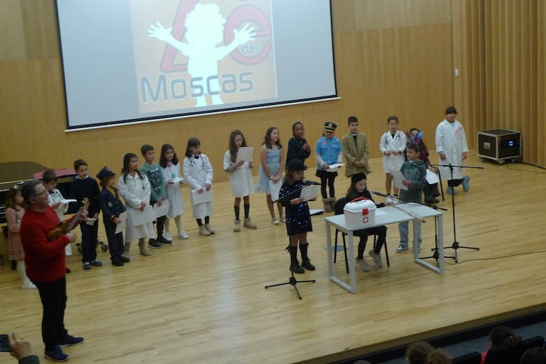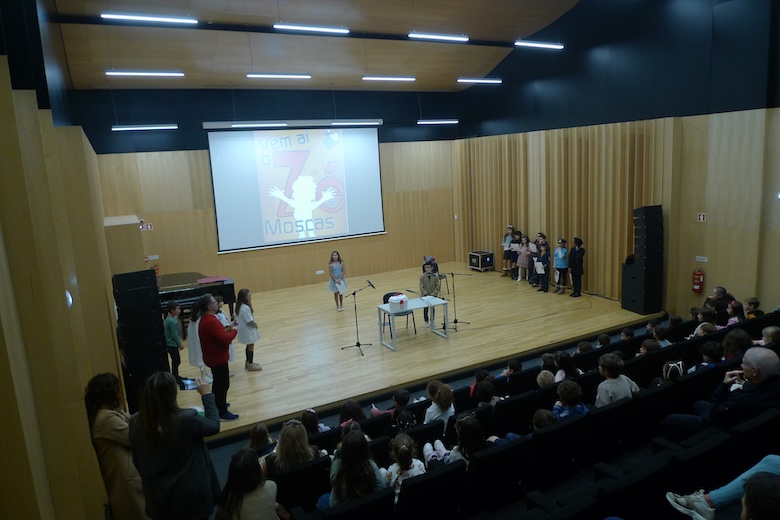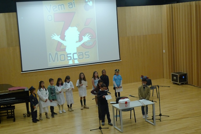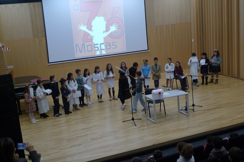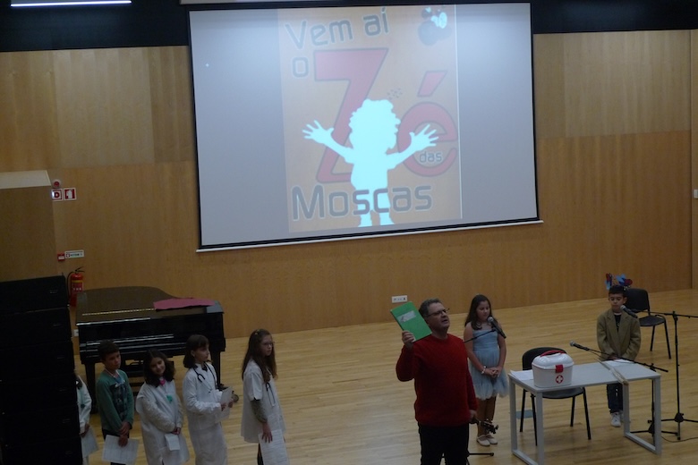 O workshop do drama musicado "Vem aí o Zé das Moscas", construído a partir de um texto de António Torrado e orientado pelo professor Filipe Passos — técnico especializado do agrupamento no âmbito do Plano de Desenvolvimento Pessoal, Social e Comunitário do Programa Nacional de Promoção do Sucesso Escolar, em articulação com as Bibliotecas Escolares e os departamentos curriculares —, passou esta semana pela Escola Básica e Secundária do Vale do Âncora, animando as manhãs dos alunos do 4º ano da sala da professora Clementina Santos. A apresentação pública do trabalho desenvolvido de expressão artística aconteceu esta quinta-feira no Auditório Municipal Ramos Pereira (agora equipado com um ótimo sistema de som e imagem), perante muitos encarregados de educação e os alunos do 1º ano das salas das professoras Deolinda Porto, Joana Silva e Verónica Miranda.